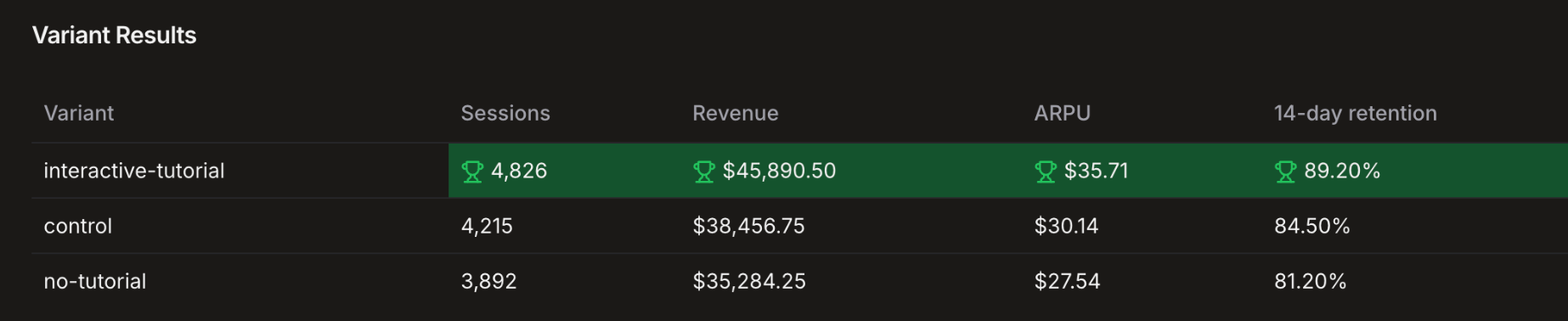 In this case, you can see that the interactive tutorial has the highest ARPU (Revenue per user) and retention by far.