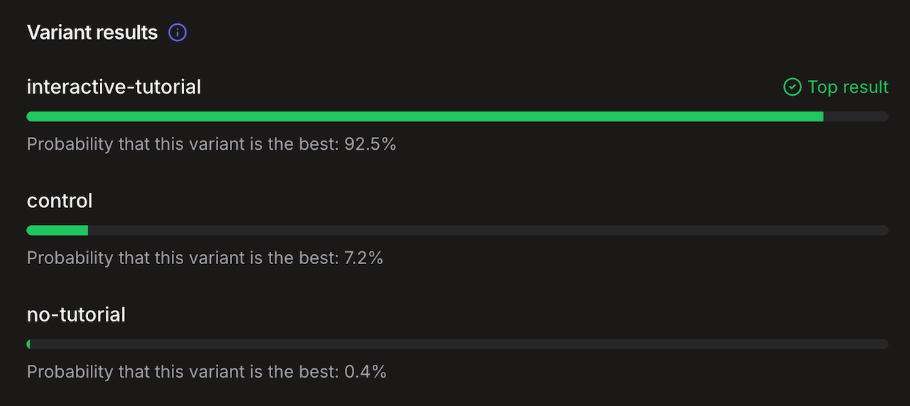The interactive tutorial has a 92.5% chance of being the best and is the top result.