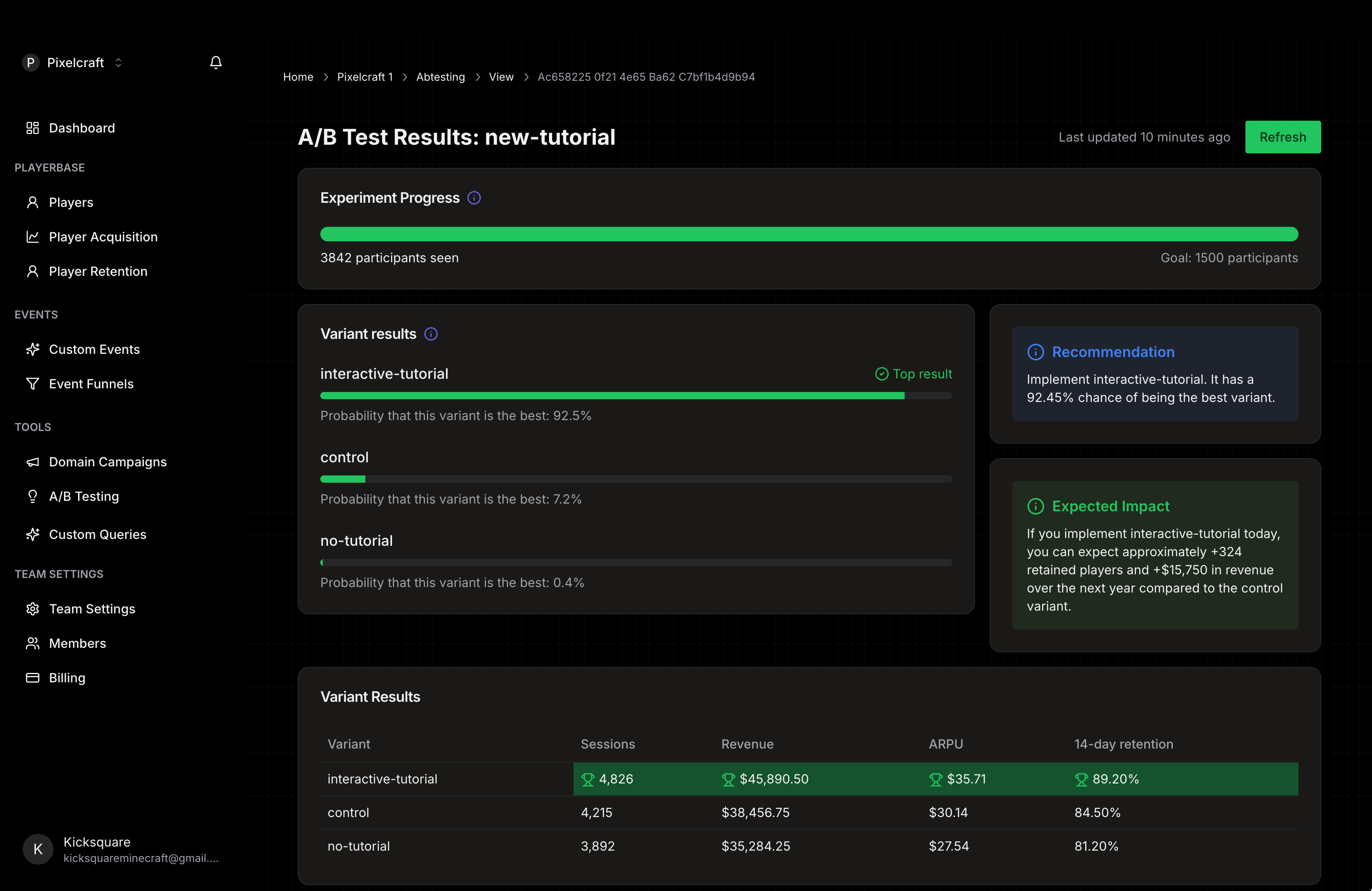 +324 retained players and +$15,750 in revenue in this example thanks to MCMetrics + A/B Testing 💪