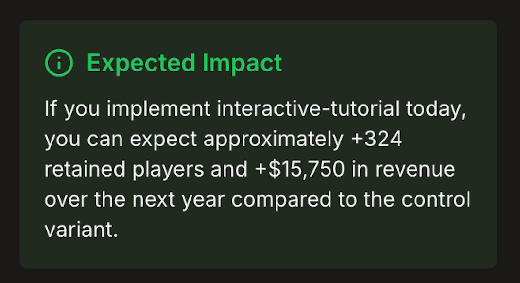 At this point, it makes sense to send 100% of players to the interactive tutorial since you have proven that it is the best tutorial. MCMetrics will even tell you how big of a difference this will make: